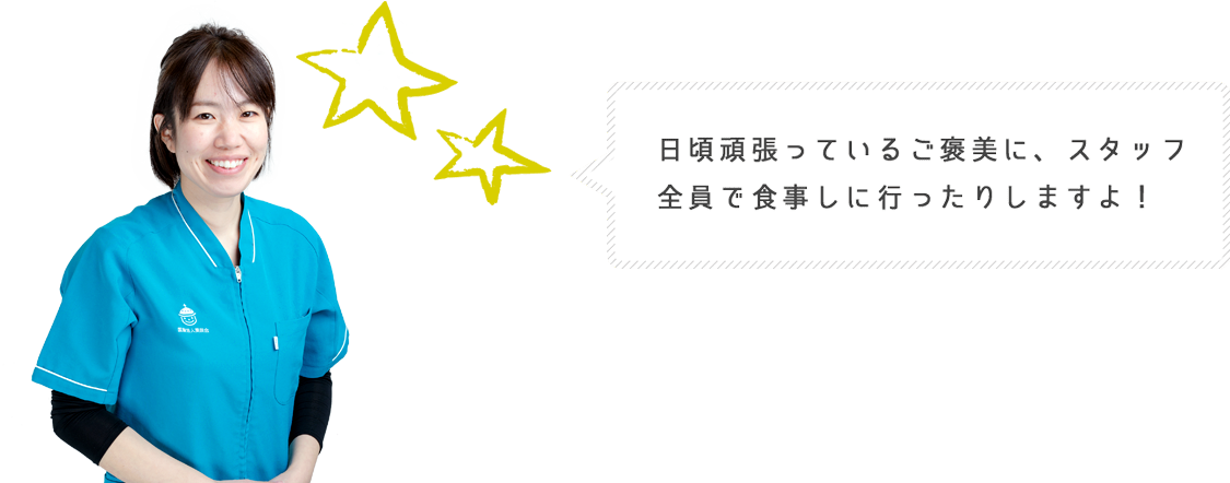 | 福利厚生 | ・制服貸与 ・バースデープレゼント ・充実安心の歯科医師国保に加入 ・歯科医師国保の健康診断 ・駐車場あり ・講習会費補助あり ・懇親会あり ・自由診療受診時と歯ブラシ購入の際は社員割引あり ・社員家族の診療費割引あり ・院内旅行あり ・Wi-Fi環境あり ・引っ越し支援金制度あり(単身の方は家賃の2割分を支給しています。) |